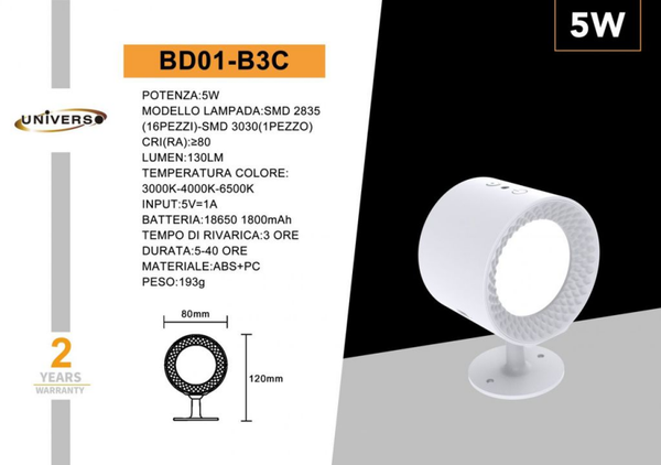 UNIVERSO APPLIQUE DA MURO USO INTERNO BD01-N3C A LED 6500K-4000K-3000K REGOLABILE