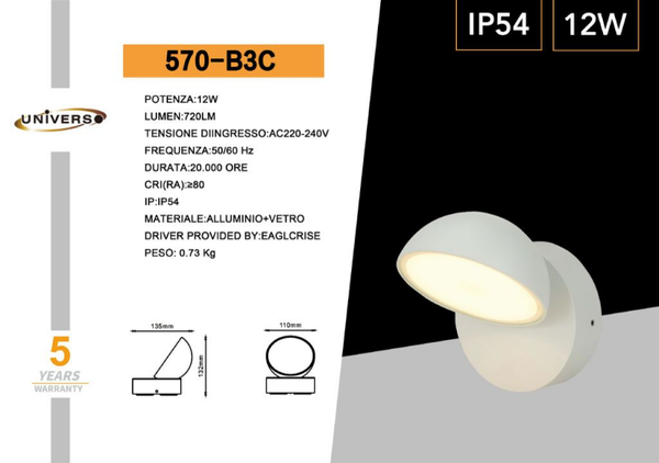 UNIVERSO APPLIQUE DA MURO USO ESTERNO 570-B3C A LED 6500K-4000K-3000K REGOLABILE