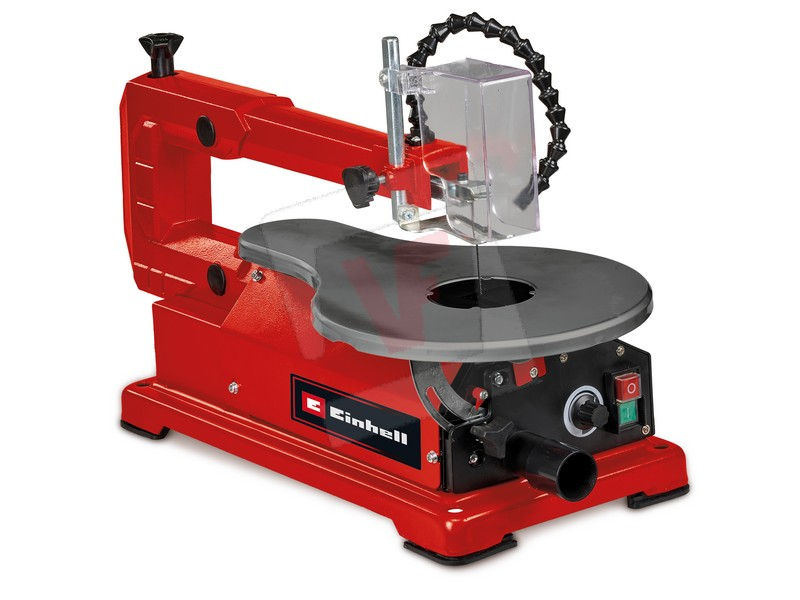 Regolazione elettronica oscillazioni, piano di lavoro in metallo inclinabile 45°, dispositivo di sgancio rapido per cambio lama, adattatore lame, attacco per aspirazione, fissabile con viti sul banco da lavoro. In dotazione: 2 lame per compensato.